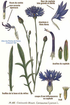 Cornflower has a long history of herbal use, though it is seldom employed nowadays. In France it is still used as a remedy for tired eyes, but opinions differ as to its efficacy[254, 268]. Traditionally it is said to work best on blue eyes, whilst Plantago major (great plantain) was used for brown eyes[268]. The dried flowers are antipruritic, antitussive, astringent, weakly diuretic, emmenagogue, ophthalmic, very mildly purgative, and tonic[4, 7, 9, 21, 201, 240]. An infusion can be used in the treatment of dropsy, constipation, or as a mouthwash for ulcers and bleeding gums[9, 238]. This infusion is also taken as a bitter tonic and stimulant, improving the digestion and possibly supporting the liver as well as improving resistance to infections[254]. A water distilled from the petals was formerly in repute as a remedy for weak eyes[4] and a soothing lotion for conjunctivitis[7, 240]. The seeds are used as a mild laxative for children[7, 254]. A decoction of the leaves is antirheumatic[7, 254]. Antifungal [303].