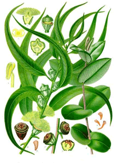 Eucalyptus leaves are a traditional Aboriginal herbal remedy. The essential oil found in the leaves is a powerful antiseptic and is used all over the world for relieving coughs and colds, sore throats and other infections[254]. The essential oil is a common ingredient in many over-the-counter cold remedies[254]. The adult leaves, without their petioles, are antiperiodic, antiseptic, aromatic, deodorant, expectorant, febrifuge, hypoglycaemic and stimulant[4, 7, 21, 46]. The leaves, and the essential oil they contain, are antiseptic, antispasmodic, expectorant, febrifuge and stimulant[218]. Extracts of the leaves have antibacterial activity[218]. The essential oil obtained from various species of eucalyptus is a very powerful antiseptic, especially when it is old, because ozone is formed in it on exposure to air. It has a decided disinfectant action, destroying the lower forms of life[4]. The oil can be used externally, applied to cuts, skin infections etc, it can also be inhaled for treating blocked nasal passages, it can be gargled for sore throat and can also be taken internally for a wide range of complaints[4]. Some caution is advised, however, because like all essential oils, it can have a deleterious effect on the body in larger doses[4]. The oil from this species has a somewhat disagreeable odour and so it is no longer used so frequently for medicinal purposes, other members of the genus being used instead[4]. An oleo- resin is exuded from the tree[238]. It can also be obtained from the tree by making incisions in the trunk[4, 152]. This resin contains tannin and is powerfully astringent, it is used internally in the treatment of diarrhoea and bladder inflammation[4, 152, 238], externally it is applied to cuts etc[4, 152]. The essential oil is used in aromatherapy. Its keyword is 'Respiratory system'[210].