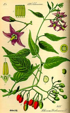 Bittersweet is a poisonous plant that has a long history of use in the treatment of skin diseases, warts, tumours, felons etc[238]. It should be used with caution and only under the supervision of a qualified practitioner, this is a poisonous plant that, in excess, paralyzes the central nervous system, slows the heart and respiration, and lowers temperature, causing vertigo, delirium, convulsions and death[21, 238]. See also the notes above on toxicity. All parts of the plant are alterative, anodyne, depurative, mildly diuretic, emetic, expectorant, hepatic, mildly narcotic and purgative[4, 7, 9, 13, 21, 165]. The dried stem, usually collected in the autumn and preferably from the ends of branches 2 - 3 years old, is the part that is most valued medicinally, though the leaves are also used[4]. The plant is chiefly used as an alterative when taken internally in the treatment of a range of skin diseases, it is also used in the treatment of arthritis, rheumatism, bronchial congestion, heart ailments, ulcerative colitis and jaundice[4, 218, 238]. Externally, the plant is used to treat skin eruptions, ulcers, rheumatism and cellulite[238]. Two to three year old stems are harvested in the spring, or after the leaves have fallen in the autumn, and dried for later use[238]. The fruits are marinated in vinegar and applied to cancerous sores and other swellings[218]. A decoction of the root is used in the treatment of cancer and swellings[218]. The root is harvested in the autumn and dried for later use[238]. A homeopathic remedy is made from the fresh, green, still pliant stems and leaves, harvested as the plant begins to flower[232]. This is used in treating a variety of complaints including backaches, cough, diarrhoea, eye inflammations and joint pains[232]. The German Commission E Monographs, a therapeutic guide to herbal medicine, approve Solanum dulcamara for eczema, furuncles (boils), acne, warts (see [302] for critics of commission E).