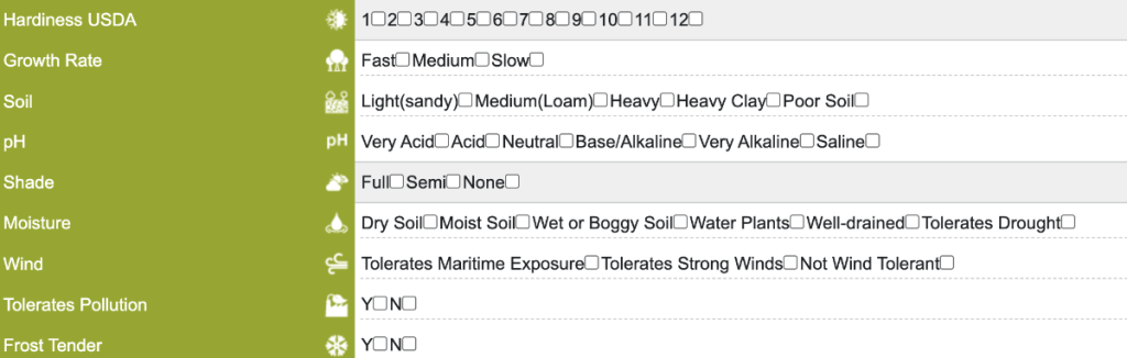 - Open the PFAF database search and set: Zone → Moisture → Frost → Wind → pH → Soil → Shade → Growth rate.
