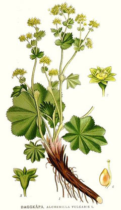 Lady's mantle has a long history of herbal use, mainly as an external treatment for cuts and wounds, and internally in the treatment of diarrhoea and a number of women's ailments, especially menstrual problems[9, 244]. The herb is alterative, antirheumatic, astringent, diuretic, emmenagogue, febrifuge, sedative, styptic, tonic and vulnerary[4, 7, 9, 21, 46, 165]. The leaves and flowering stems are best harvested as the plant comes into flower and can then be dried for later use[4]. The fresh root has similar and perhaps stronger properties to the leaves, but is less often used[4]. The plant is rich in tannin and so is an effective astringent and styptic, commonly used both internally and externally in the treatment of wounds[4]. It helps stop vaginal discharge and is also used as a treatment for excessive menstruation and to heal lesions after pregnancy[4, 244]. Prolonged use can ease the discomfort of the menopause and excessive menstruation[268]. The freshly pressed juice is used to help heal skin troubles such as acne and a weak decoction of the plant has been used in the treatment of conjunctivitis[244].