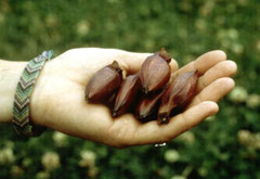 Seed - raw or cooked. Rich in starch[183]. The seed is soft like a cashew nut and has a slight flavour of pine nuts. This is a delicious seed and it makes very pleasant eating. It is a food that can easily be eaten in quantity and can be used as a staple food in the diet[K]. Fairly large, the seeds are about the size of an almond and can be 3cm long x 1cm wide. They are harvested in the autumn and, when kept in cool, dry conditions will store for at least 9 months[K].