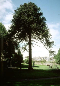Landscape Uses:Pest tolerant, Aggressive surface roots possible, Specimen. Prefers a deep well-drained soil[11, 200]. Dislikes hot dry soils[1]. Dislikes atmospheric pollution[166]. Very tolerant of maritime exposure and salt laden winds[75, 81]. The monkey puzzle is a very slow growing tree that can take 5 - 10 years before it even gets above grass height and then grows around 35cm a year[185]. New growth takes place from late June to September[185]. The seed forms a staple food for the native Indians in regions where it grows in Chile, it is also sold in local markets there[46, 139]. This tree has an excellent potential to become a commercial crop in the western parts of Britain, it is high yielding, has large tasty seeds and is easily harvested. Its main disadvantages are its slow rate of growth and the time it takes before the first crop is produced - this can be up to 40 years from seed though we have often seen plants less than 20 years old produce cones[K]. The plant is dioecious so at least one male plant needs to be grown for every 5 - 6 females - unfortunately there is no way of telling the sex of the tree until it flowers. There are means of vegetative reproduction and it might be possible to produce clones of known sex in the future - these will probably come into bearing at an earlier age. If you have the space to plant at least 5 trees, and the foresight, this is a tree that will be a very valuable food crop in the future[K]. It is said that 18 good-sized trees can provide enough for an adult's sustenance all year round[2]. Plants grow best in S.W. England and along the west coast of Britain where they produce seed regularly and abundantly[11, 80]. Female cones take 2 - 3 years to mature and break up at the end of the year[185]. They contain up to 200 large seeds. Plants self-sow in Cornwall[80]. We have records of trees regularly producing good crops of seeds in various sites in Cornwall, Devon and the west coast of Scotland. We also have one report of an excellent crop in 1997 from trees at Alvaston Castle near Derby and of a tree in Bedfordshire producing a heavy crop[K]. Trees are notably susceptible to honey fungus[81, 200]. Unlike most conifers, this tree can be coppiced[81]. Special Features: