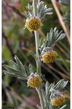 Hardy perennial, mat-forming with silvery, aromatic foliage. Provides soil stabilization in prairies and forage for wildlife (though unpalatable to livestock). Blooms in summer; seeds mature late season. Requires a sunny position and a well-drained soil that is not too rich[1, 200]. Requires a lime-free soil. Established plants are very drought-tolerant [200]. Plants are longer lived, more hardy and more aromatic when they are grown in a poor dry soil[245]. A very ornamental plant[1]. Members of this genus are rarely, if ever, troubled by browsing deer[233]. For polyculture design, as well as the above-ground architecture (form - tree, shrub, etc., and size shown above), information on the habit and root pattern is also provided, if available. The plant growth habit is a clumper with limited spread [1-2]. The root pattern is fibrous, dividing into a large number of fine roots [1-2].