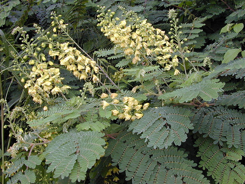 Cat’s claws; cat's-claw; Mauritius-thorn; thorny poinciana; wait-a-bit; wait-a-while; woody wait-a-while. Spanish: agarra ladrón; chembé bolé; chícara cimarrona; zarza de cercas. French: brésillet du Japon; césalpinie du Japon. Chinese: yun shi. Australia: Mauritius thorn; shoofly; tiger stopper; whoa back. Germany: Cäsalpinie, Japanische; Mauritius-dorn. Haiti: chembe bolo; ti-janvier; tijavier. Indian Punjab: aila; chillari; gilo; karur; kurutu-gajjika; relan. Indonesia: areuy matahiyang gunung. Italy: cesalpinia giapponese. Japan: jaketsu-ibara. Lesser Antilles: arrête-boeuf; caniroc. Myanmar: sukyanbo. Nusa Tenggara: secang lembut. South Africa: kraaldoring (Afrikaans); ubobo-encane (Zulu); ufenisi. Thailand: kamchai. Vietnam: vu'ôt hùm.
