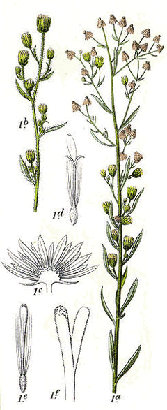 In traditional North American herbal medicine, Canada fleabane was boiled to make steam for sweat lodges, taken as a snuff to stimulate sneezing during the course of a cold and burned to create a smoke that warded off insects[254]. Nowadays it is valued most for its astringency, being used in the treatment of gastro-intestinal problems such as diarrhoea and dysentery[254]. It is said to be a very effective treatment for bleeding haemorrhoids[254]. The whole plant is antirheumatic, astringent, balsamic, diuretic, emmenagogue, styptic, tonic and vermifuge[4, 7, 9, 21, 222]. It can be harvested at any time that it is in flower and is best used when fresh[4, 207, 238]. The dried herb should not be stored for more than a year[238]. The seeds can also be used[4]. An infusion of the plant has been used to treat diarrhoea and internal haemorrhages[213] or applied externally to treat gonorrhoea[213] and bleeding piles[7]. The leaves are experimentally hypoglycaemic[218]. The essential oil found in the leaves is used in the treatment of diarrhoea, dysentery and internal haemorrhages[4, 207, 218]. It is a uterine stimulant[213] and is also said to be valuable in the treatment of inflamed tonsils plus ulceration and inflammation of the throat[4]. A tea of the boiled roots is used to treat menstrual irregularities[213]. A homeopathic remedy is made from the plant[9]. It is used in the treatment of haemorrhoids and painful menstruation[9].