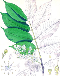 Other Uses: An oleoresin is obtained from the tree[ 46 ]. It is used in varnishes and lacquers; for photographic paper; removing varnish from old oil paintings etc[ 46 ]. The resin can be used, direct from the tree, as a substitute for diesel oil[ 238 ]. The heartwood is pink to red-brown with copper-coloured veins; it is clearly demarcated from the 2 - 3cm wide band of sapwood. The texture is medium; the grain straight or interlocked, sometimes wavy. The wood is light to very light in weight, soft to moderately hard; somewhat durable being resistant to dry wood borers but susceptible to fungi and termites. It seasons quickly with very little risk of checking or distortion; once dry it is moderately stable to stable in service. It can be worked with normal tools, though they need to be kept sharp to avoid fuzzy surfaces; nailing and screwing are often poor; gluing is correct[ 848 ]. An excellent timber[ 461 ], the wood has a wide range of uses, including for light carpentry, interior panelling and joinery, flooring, boxes and crates, furniture, veneer and fibre boards[ 848 ].