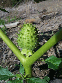The thornapple is a bitter narcotic plant that relieves pain and encourages healing[238]. It has a long history of use as a herbal medicine, though it is very poisonous and should be used with extreme caution. The leaves, flowering tops and seeds are anodyne, antiasthmatic, antispasmodic, hallucinogenic, hypnotic, mydriatic and narcotic[1, 4, 7, 9, 13, 21, 46, 165, 238, 240]. The seeds are the most active medicinally[4]. The plant is used internally in the treatment of asthma and Parkinson's disease, excess causes giddiness, dry mouth, hallucinations and coma[238]. Externally, it is used as a poultice or wash in the treatment of fistulas, abscesses wounds and severe neuralgia[238, 257]. The use of this plant is subject to legal restrictions in some countries[238]. It should be used with extreme caution and only under the supervision of a qualified practitioner since all parts of the plant are very poisonous and the difference between a medicinal dose and a toxic dose is very small[21, 213, 238]. The leaves should be harvested when the plant is in full flower, they are then dried for later use[4]. The leaves can be used as a very powerful mind-altering drug, they contain hyoscyamine and atropine[213]. There are also traces of scopolamine, a potent cholinergic-blocking hallucinogen, which has been used to calm schizoid patients[213]. Atropine dilates the pupils and is used in eye surgery[222]. The leaves have been smoked as an antispasmodic in the treatment for asthma, though this practice is extremely dangerous[213, 222]. The seeds are used in Tibetan medicine, they are said to have a bitter and acrid taste with a cooling and very poisonous potency[241]. Analgesic, anthelmintic and anti-inflammatory, they are used in the treatment of stomach and intestinal pain due to worm infestation, toothache and fever from inflammations[241]. The juice of the fruit is applied to the scalp to treat dandruff[243].