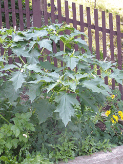 Landscape Uses: Border, Container, Foundation, Specimen. Succeeds in most moderately good soils but prefers a rich light sandy soil or a calcareous loam, and an open sunny position[1, 4, 200]. Plants often self-sow when well sited[1]. The thornapple is cultivated commercially as a medicinal plant[57]. It can become a weed in suitable conditions and is subject to statutory control in some countries[238]. This species is extremely susceptible to the various viruses that afflict the potato family (Solanaceae), it can act as a centre of infection so should not be grown near potatoes or tomatoes[200]. Grows well with pumpkins[20]. The whole plant gives off a nauseating stench[245]. Special Features: