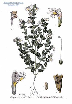 Eyebright has a long history of herbal use in the treatment of eye problems and is still in current herbal use[4]. It is important that only the correct forms of eyebright, with glandular hairs on the calyx, are used, since other forms do not possess medicinal virtues[268]. Eyebright tightens the mucous membranes of the eye and appears to relieve the inflammation of conjunctivitis and blepharitis[254]. Its ability to counter catarrh means that it is often used for infectious and allergic conditions affecting the eyes, middle ear, sinuses and nasal passages[254]. The whole plant is anti-inflammatory, astringent, digestive, ophthalmic and slightly tonic[[4, 7, 9, 14, 165, 220]. It is taken internally in the treatment of catarrh, sinusitis, hay fever, upper respiratory tract infections etc[238]. As an ophthalmic, an infusion of the plant can be taken internally or used as an eye wash. Alternatively, the diluted juice can be dropped into the eyes[232]. Some caution should be exercised, experimentally it can induce side effects including dim vision[222]. The plant's astringency makes it inappropriate for treating dry or stuffy congestion[254]. The plant can be used externally as a poultice to aid the healing of wounds[268]. Eyebright should be harvested when in flower and can be dried for later use[238]. The dried herb is a ingredient of herbal smoking mixtures, used in the treatment of chronic bronchial colds[4]. A homeopathic remedy is made from the expressed juice of the plant[232]. It is used particularly in the treatment of eye inflammations and colds[7, 232].