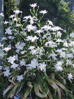 Iris japonica is an evergreen Perennial growing to 0.6 m (2ft) by 1 m (3ft 3in). It is in leaf all year, in flower in April, and the seeds ripen from July to August. The species is hermaphrodite (has both male and female organs) and is pollinated by Insects. The plant is self-fertile.