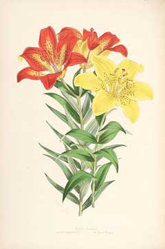 Prefers an open free-draining humus-rich loamy soil with its roots in the shade and its head in the sun[200]. This name possibly covers a group of hybrids involving L. dauricum x L. concolor[200]. Widely cultivated for ornament, there are many named varieties[58, 200]. Early to mid autumn is the best time to plant out the bulbs in cool temperate areas, in warmer areas they can be planted out as late as late autumn[200]. The plant should be protected against rabbits and slugs in early spring. If the shoot tip is eaten out the bulb will not grow in that year and will lose vigour[200].