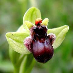 Plants can be grown in a lawn, but the lawn must not be cut until the plants have set seed[200]. Orchids are, in general, shallow-rooting plants of well-drained low-fertility soils. Their symbiotic relationship with a fungus in the soil allows them to obtain sufficient nutrients and be able to compete successfully with other plants. They are very sensitive to the addition of fertilizers or fungicides since these can harm the symbiotic fungus and thus kill the orchid[230]. This symbiotic relationship makes them very difficult to cultivate, though they will sometimes appear uninvited in a garden and will then thrive. Transplanting can damage the relationship and plants might also thrive for a few years and then disappear, suggesting that they might be short-lived perennials[230]. This species is not hardy in the colder areas of the country, it tolerates temperatures down to between -5 and -10°c[200]. The flowers resemble a female insect and also emit a scent similar to female pheremones, they are pollinated by a male insect of that species attempting to copulate with the flower[200]. Tubers should be planted out whilst they are dormant, this is probably best done in the autumn[200]. They should be planted at least 5cm below soil level[200].