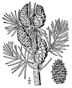 A tan or green dye is obtained from the needles[168]. Various native North American Indian tribes made a string from the long roots of this species and used it to stitch the bark of their canoes[226, 257]. In a sandy soil, the roots of this species extend near the surface of the soil for perhaps 10 metres and are easy to pull out of the ground for their entire length. When gathered, they were made into coils and sunk beneath the surface of water until the outer bark had loosened from the root. They were then peeled and split in half, each half being a serviceable cord for sewing together canoes and bark strips intended for the roofs of wigwams and other purposes[257]. The needles contain a substance called terpene, this is released when rain washes over the needles and it has a negative effect on the germination of some plants, including wheat[201]. Oleo-resins are present in the tissues of all species of pines, but these are often not present in sufficient quantity to make their extraction economically worthwhile[64]. The resins are obtained by tapping the trunk, or by destructive distillation of the wood[4, 64]. In general, trees from warmer areas of distribution give the higher yields[64]. Turpentine consists of an average of 20% of the oleo-resin[64] and is separated by distillation[4, 64]. Turpentine has a wide range of uses including as a solvent for waxes etc, for making varnish, medicinal etc[4]. Rosin is the substance left after turpentine is removed. This is used by violinists on their bows and also in making sealing wax, varnish etc[4]. Pitch can also be obtained from the resin and is used for waterproofing, as a wood preservative etc[257]. Wood - fairly light, soft, coarse, weak[46, 61, 82, 226]. It weighs 27lb per cubic foot[235]. It is mainly used for fuel, though occasionally also for posts, pulp and lumber[46, 61, 82, 226].