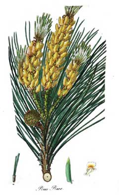The turpentine obtained from the resin of all pine trees is antiseptic, diuretic, rubefacient and vermifuge[4]. It is a valuable remedy used internally in the treatment of kidney and bladder complaints and is used both internally and as a rub and steam bath in the treatment of rheumatic affections[4]. It is also very beneficial to the respiratory system and so is useful in treating diseases of the mucous membranes and respiratory complaints such as coughs, colds, influenza and TB[4]. Externally it is a very beneficial treatment for a variety of skin complaints, wounds, sores, burns, boils etc and is used in the form of liniment plasters, poultices, herbal steam baths and inhalers[4].