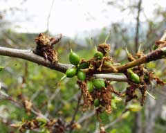 Thrives in a well-drained moisture-retentive loamy soil, growing well on limestone[11, 200]. Prefers some lime in the soil but is likely to become chlorotic if too much lime is present[1]. Succeeds in sun or partial shade though it fruits better in a sunny position[11, 200]. Three shrubs at Kew in September 1993 were about 1.5 metres tall and still had a few fruits on them, though there was evidence that they had carried a large crop[K]. They fruited well again in 1994[K]. Most members of this genus are shallow-rooted and will produce suckers if the roots are damaged[238]. Plants in this genus are notably susceptible to honey fungus[200].
