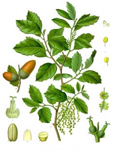 A mulch of the leaves repels slugs, grubs etc, though fresh leaves should not be used as these can inhibit plant growth. Oak galls are excrescences that are sometimes produced in great numbers on the tree and are caused by the activity of the larvae of different insects. The insects live inside these galls, obtaining their nutrient therein. When the insect pupates and leaves, the gall can be used as a rich source of tannin, that can also be used as a dyestuff[4]. A fairly wind-tolerant tree, it can be used in shelterbelt plantings[200]. Good on dry banks. Shade tree. Bark is the source of cork, it is much used for heat and sound insulation, flooring, floats etc. Trees are first harvested when they are 25 - 30 years old[74], and then harvested every 6 - 12 years[117]. The bark must be removed carefully so as not to harm the tree. A large tree can yield up to 1 tonne of cork. On a 10% moisture basis, the bark contains 16.9% tannin[223]. Wood.