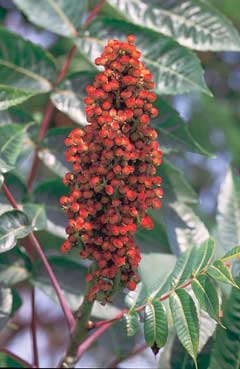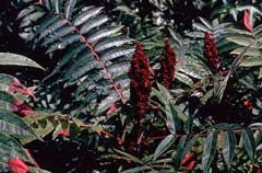 Agroforestry uses: Sumac can be used for erosion control, as a nitrogen-fixing plant, and for hedges or borders. Its dense growth habit provides cover and habitat for wildlife. Landscape Uses: Border, Specimen. The leaves are rich in tannin, containing about 10 - 25%[171]. Up to 31.2% has been obtained from some plants[223]. They can be collected as they fall in the autumn and used as a brown dye or as a mordant[169]. The twigs and root are also rich in tannin[149]. A black and a red dye is obtained from the fruit[4, 257]. A black dye is obtained from the leaves, bark and roots[257]. An orange or yellow dye is obtained from the roots harvested in spring[46, 61, 257]. A light yellow dye is obtained from the pulp of the stems[257]. The inner bark, mixed with bloodroot (Sanguinaria canadensis) and the inner bark of wild plum (Prunus sp.) has been used to make a yellow dye[257]. An oil is extracted from the seeds[4]. It attains a tallow-like consistency on standing and is used to make candles. These burn brilliantly, though they emit a pungent smoke[4]. The plant has an extensive root system and is fairly wind tolerant, though branches can be broken off in very strong winds. It is planted for soil stabilization and as a shelter screen[200]. It can quickly establish itself in open sunny locations and so can be used as a pioneer species for establishing woodlands[229]. Wood - soft, light, brittle[101, 149]. 1. Nectary - Flowers rich in nectar and pollen: