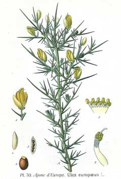 Gorse has never played much of a role in herbal medicine, though its flowers have been used in the treatment of jaundice and as a treatment for scarlet fever in children[4]. The seed is said to be astringent and has been used in the treatment of diarrhoea and stones[4]. The plant is used in Bach flower remedies - the keywords for prescribing it are 'Hopelessness' and 'Despair'[209].