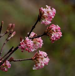 An easily grown plant, it succeeds in most soils but is ill-adapted for poor soils and for dry situations[1]. It prefers a deep rich loamy soil in sun or semi-shade[11, 200]. Best if given shade from the early morning sun in spring[200]. Requires shelter from north and east winds[200]. A very ornamental plant[1], the deliciously scented flowers are produced in the winter and the flowers are said to withstand temperatures down to -12°c without damage[11, 200]. However fruit is not often produced in this country[K]. This may be due to the plant being self-incompatible and so growing 2 or more different cultivars together may improve fruit set[11, 200]. Hand pollination may also be beneficial as well as siting the plants so that they get the maximum of protection from severe winter weather[K]. A position against an east-facing wall, or on the edge of a woodland, would be ideal for this[K]. Closely allied to V. farreri. The very closely related species V. foetens, which is often included as part of this genus, has a more westerly range, shorter stems and white flowers.