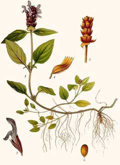 Self heal has a long history of folk use, especially in the treatment of wounds, ulcers, sores etc[7]. It was also taken internally as a tea in the treatment of fevers, diarrhoea, sore mouth, internal bleeding etc[4, 222]. In Korea it is used to treat oedema, nephritis, scrofula and goitre[279]. The whole plant is alterative, antibacterial, antipyretic, antiseptic, antispasmodic, astringent, carminative, diuretic, febrifuge, hypotensive, stomachic, styptic, tonic, vermifuge and vulnerary[4, 9, 13, 21, 176, 218]. It has an antibacterial action, inhibiting the growth of Pseudomonas, Bacillus typhi, E. coli, Mycobacterium tuberculi etc[176]. It can be used fresh or dried, for drying it is best harvested in mid-summer[4]. The plant is experimentally antibiotic and hypotensive[218, 222].