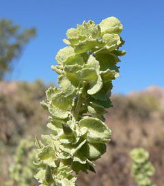 Edible uses & rating: Leaves (only cooked; in moderation), flowers (as seasoning in small amounts), seeds (technically edible but extraction is difficult). Edibility rating: 3/5. Taste & processing notes: Cooked leaves ˜ “canned spinach rolled in salt,” throat-irritating liquor—discard. Fruits smell/taste woody-grainy with odd rubber/medical overtone; husks tough/fibrous; seed isolation problematic; raw fruits unpleasant and poky. Season/harvest: 4-winged fruits mature late autumn [2-3]. Leaves - cooked or raw[85, 94. A very acceptable taste with a salty tang[K]. The leaves can be used at any time of the year though winter harvesting must be light because the plant is not growing much at this time of year[K]. Seed - cooked[46, 61]. Ground into a powder, mixed with cereals and used in making cakes etc or used as a piñole[94, 95, 183]. It is small and very fiddly to utilize[K]. The ground up seed can also be mixed with water and drunk as a refreshing beverage[183]. The burnt green herb yields culinary ashes high in minerals and these are used by the Hopi Indians to enhance the colour of blue corn products[183, 257]. The ashes can be used like baking soda[257].